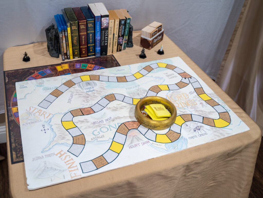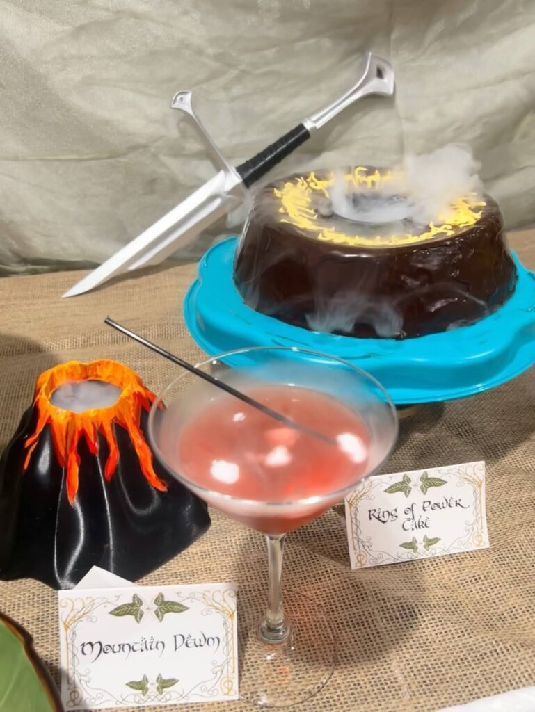 We had an incredible time hosting our Rings of Power Season 2 premiere watch party! From epic décor that brought Middle-earth to life, to a ring toss game worthy of Sauron himself, every detail was crafted with love (and a bit of 3D printing magic). Guests feasted on Lembas bread, a decadent smoking Ring of Power cake, and a full spread of “Taters, Precious” topped with “Meat’s Back on the Menu, Boys,” “Weathertop Crispy Bacon,” and “Pippin’s Peppers.” Drinks flowed with Misty Mountain mead, “They Come in Pints?” beer, and smoky Mtn Dewm cocktails.