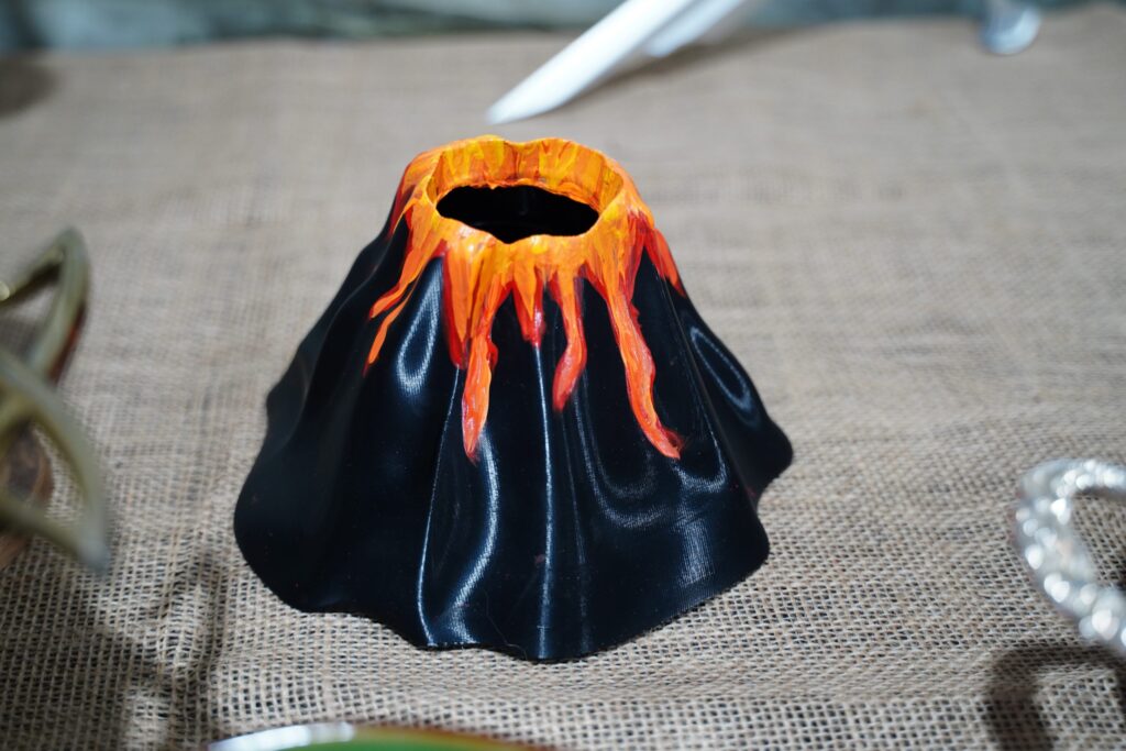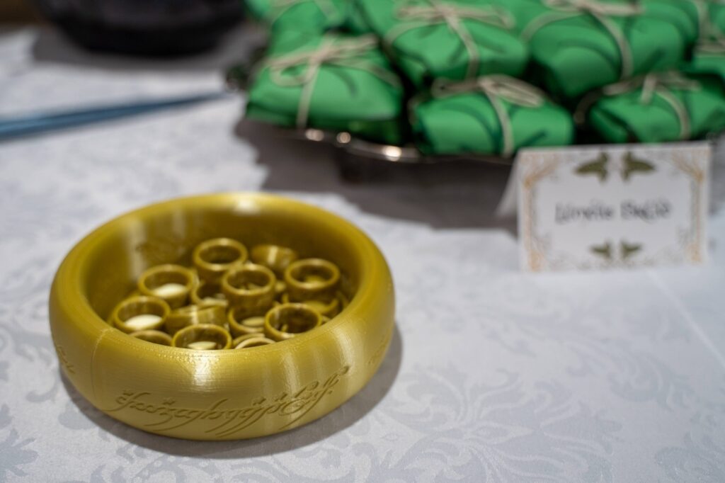 A few of the 3D printed props were the 20 Rings of Power (for a ring toss game), a Mt Doom smoldering with dry ice, a light up Gandalf staff, the tower of Orthanc, the Witch King of Angmar’s helmet, crown of Galadriel and Elrond, and the swords Narsil and Sting.