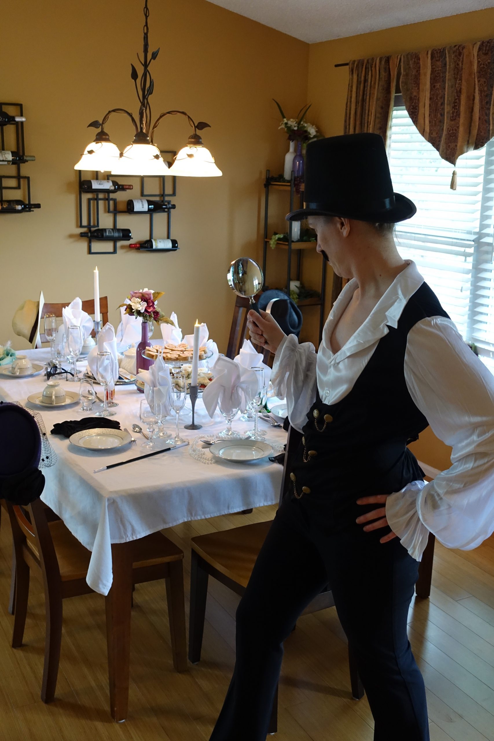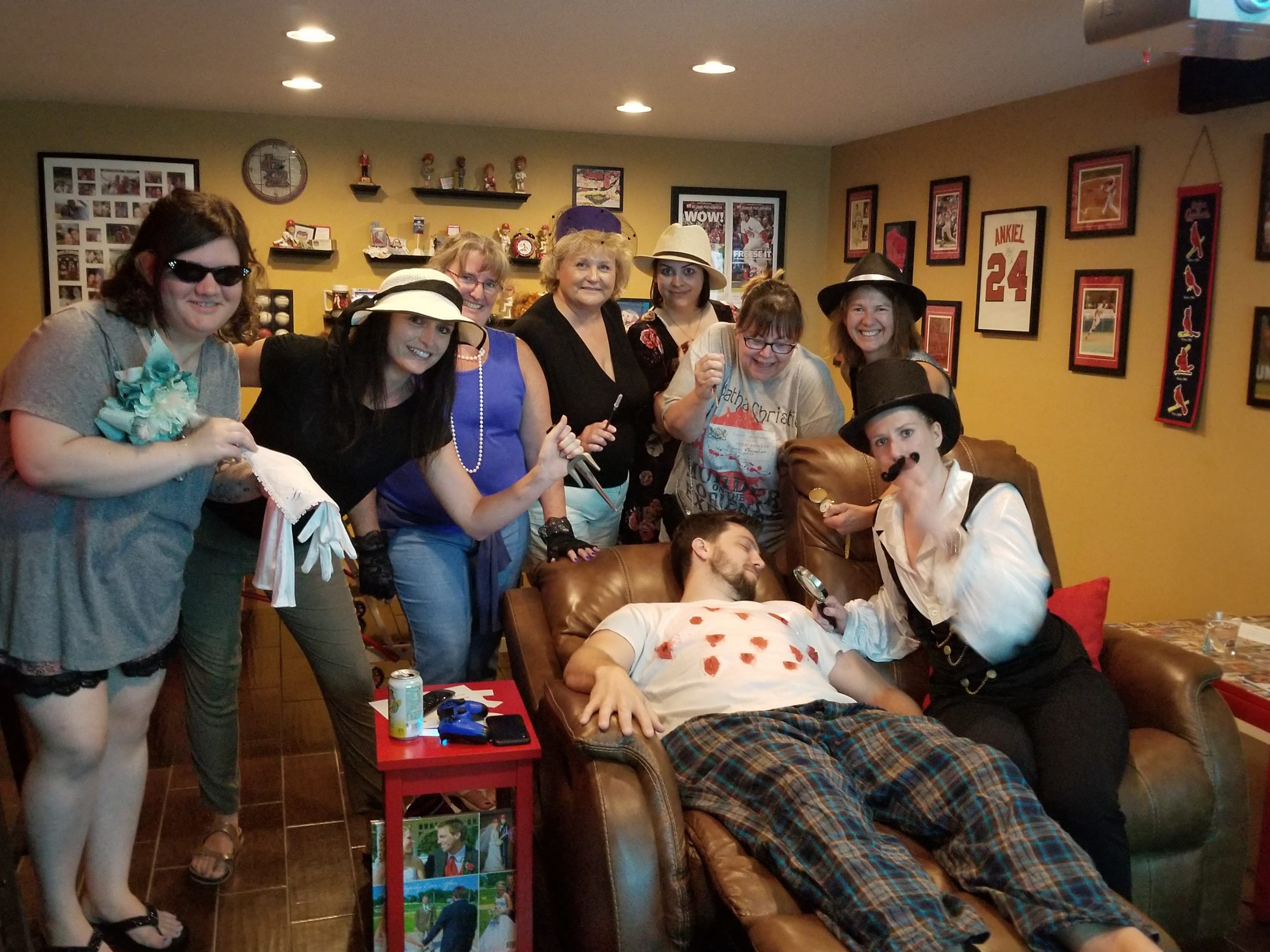 My book club read Murder on the Orient Express, so I thought I’d surprise them with a murder mystery dinner for our meeting! Each person got to be a different character from the book and use props associated with that person. We discussed characters, motives, and interesting behaviors. Clues were scattered throughout the house for us to discover and reenact the mystery. I played the Detective Hercules Poirot to lead the discussion and solve the murder mystery. Scott even joined the fun as our murder victim!