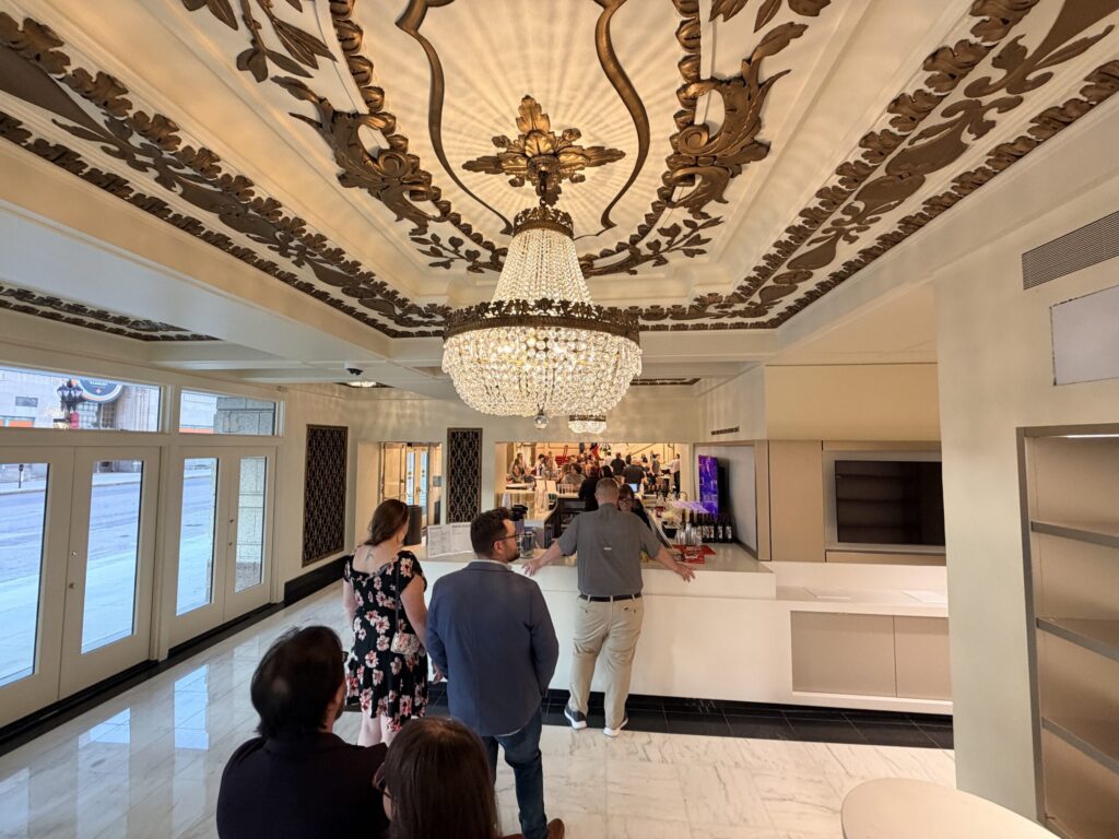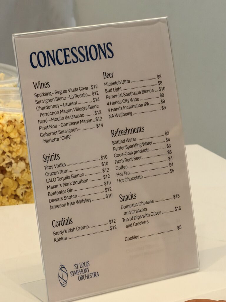The newly expanded concession and lounge areas transform intermission into part of the experience. Guests can now enjoy locally sourced snacks, wines, and craft cocktails without long lines or crowded corridors. Cozy seating nooks and social spaces invite concertgoers to linger, chat, and soak in the ambience – proof that the magic at Powell Hall doesn’t pause when the music does. Best of all, the grand original entrance hall, once bustling with arriving crowds, now serves as an elegant mingling space complete with high-top tables and room to relax, letting guests savor their drinks beneath its ornate ceilings and glittering chandeliers.