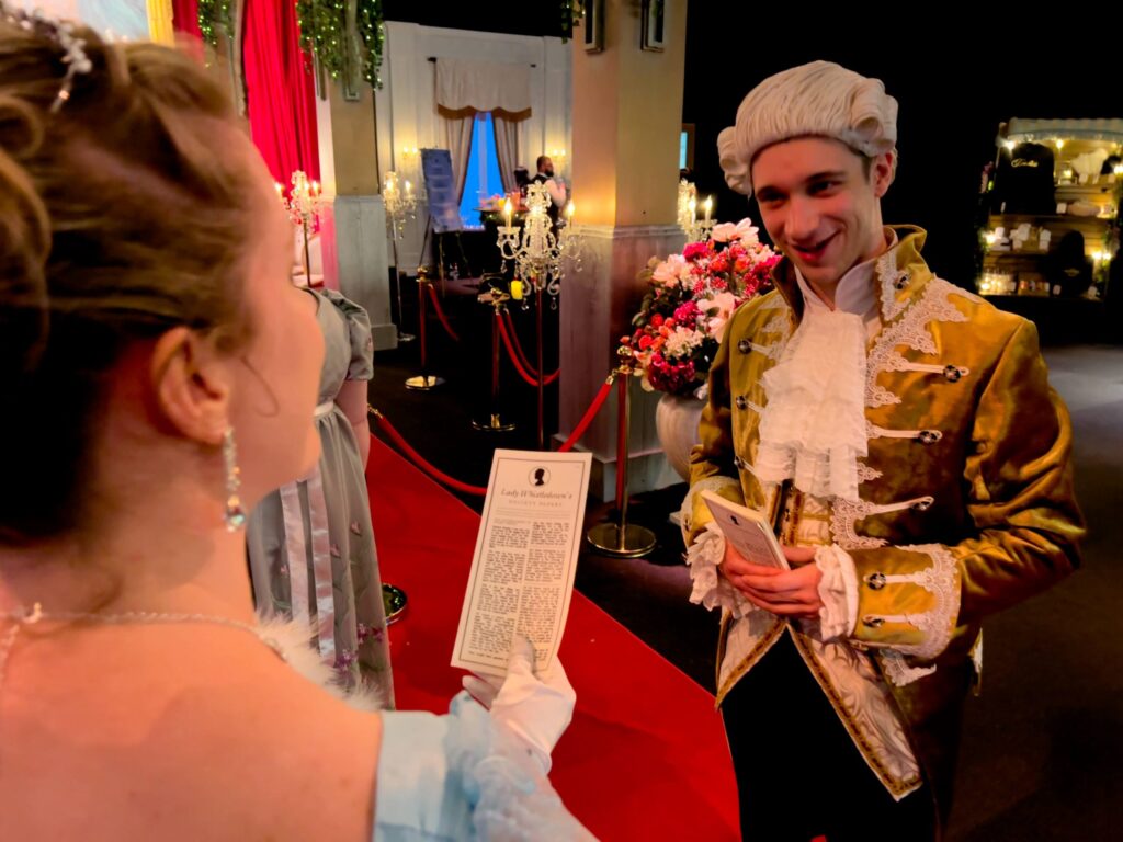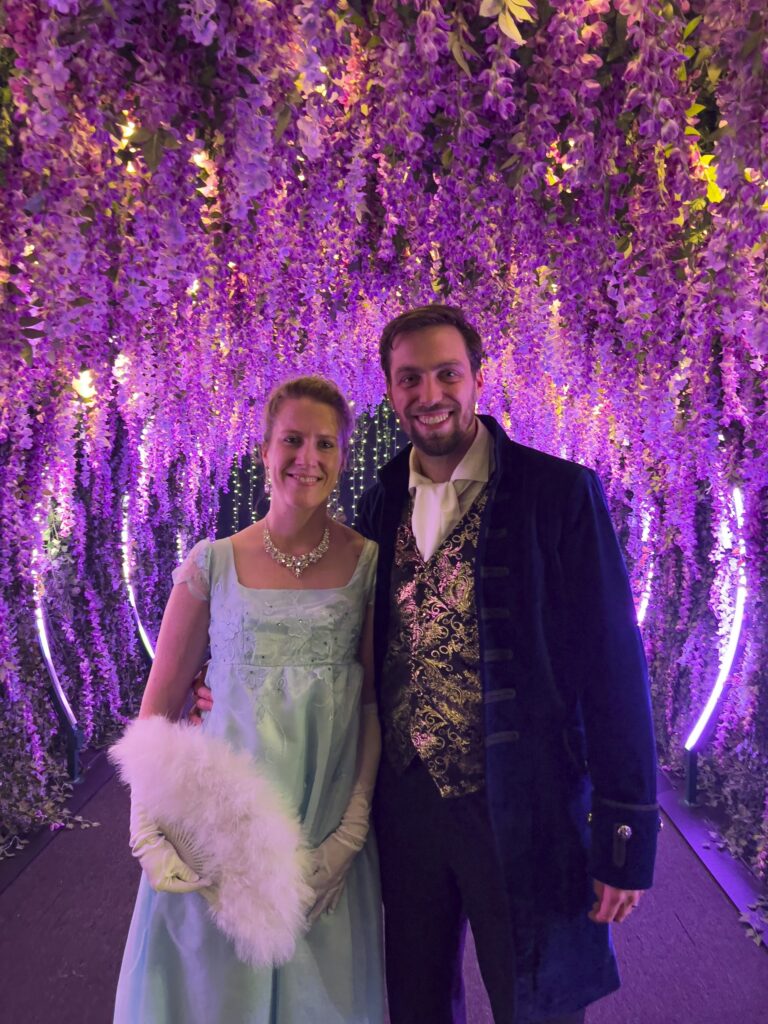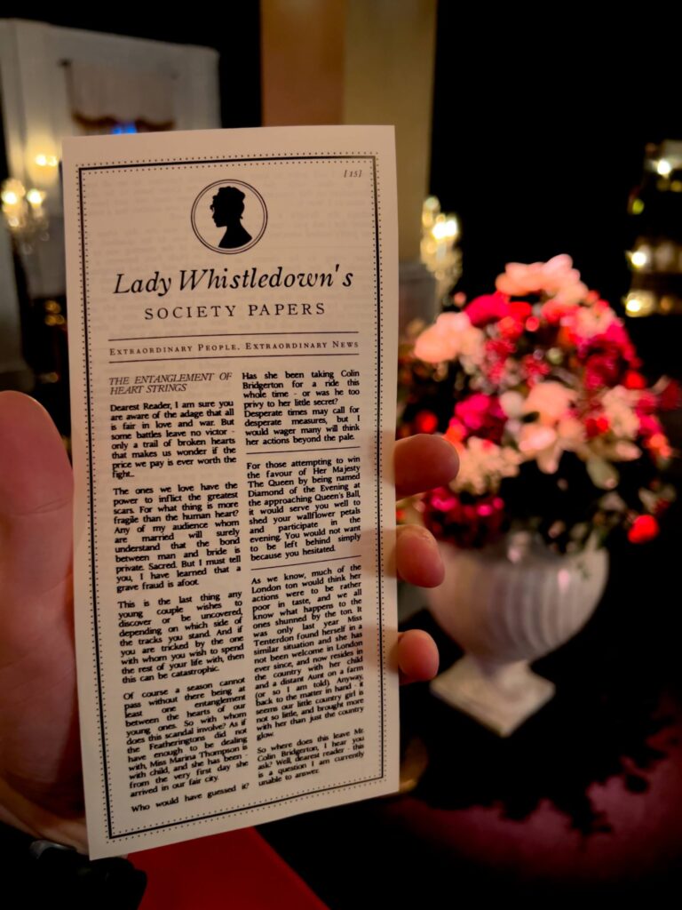 Dearest Reader, how could we possibly resist the allure of scandal and spectacle at the Queen’s Ball – Bridgerton Experience in Chicago? We strolled beneath cascading tunnels of wisteria, made our most graceful curtsies before Her Majesty, unraveled a tantalizing Whistledown mystery, admired an endless parade of stunning gowns, and danced the night away beneath chandeliers that shimmered like secrets.