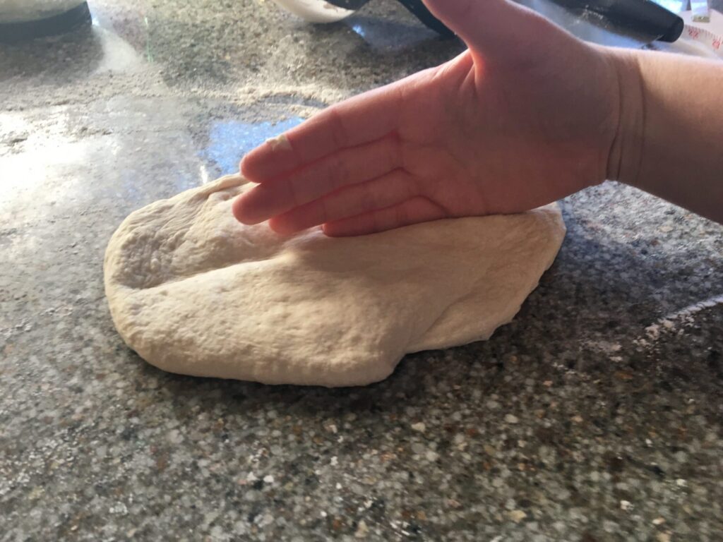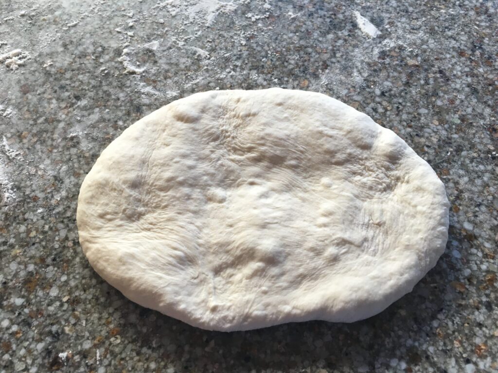 2. Pat dough ball firmly into an 8- to 10-inch oval with lightly floured palms of hand.