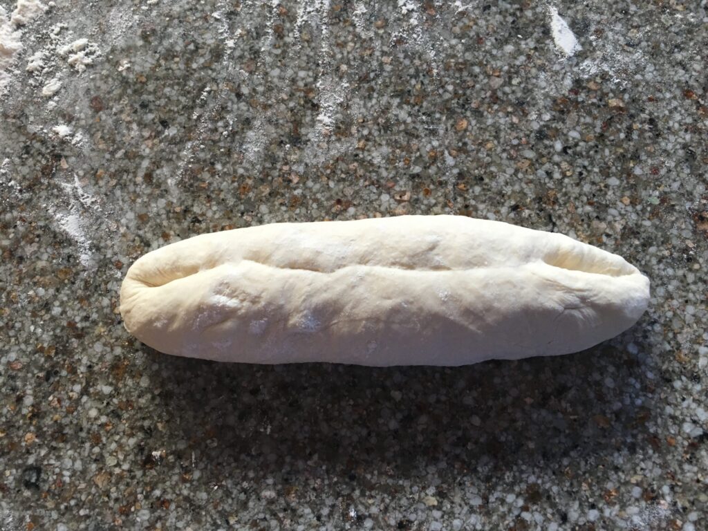 4. Flatten the dough again into an oval with your palms. Press a trench along the central length with the side of your hand. Fold the dough in half lengthwise again. Seal the edges of the dough together using the heal of one hand and roll the dough a quarter turn toward you to seal the bottom.