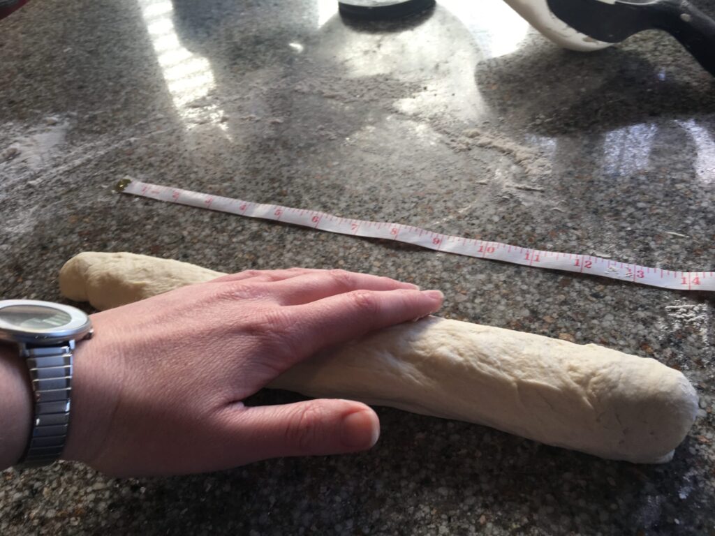 5. Now roll the dough back and forth with the palms of your hands to lengthen dough into a sausage shape. Start in the middle, placing your right palm on the dough and your left palm on top of your right hand. Continue rolling forward and backward rapidly, gradually sliding your hands toward the two ends as the dough lengthens to 16-18" for two loaves or 14" for three loaves.