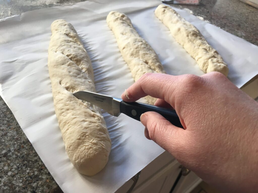 8. Slash the top of the dough using a sharp knife or razor blade (3 slashes), making sure that the blade lies almost parallel to the dough surface when cutting.