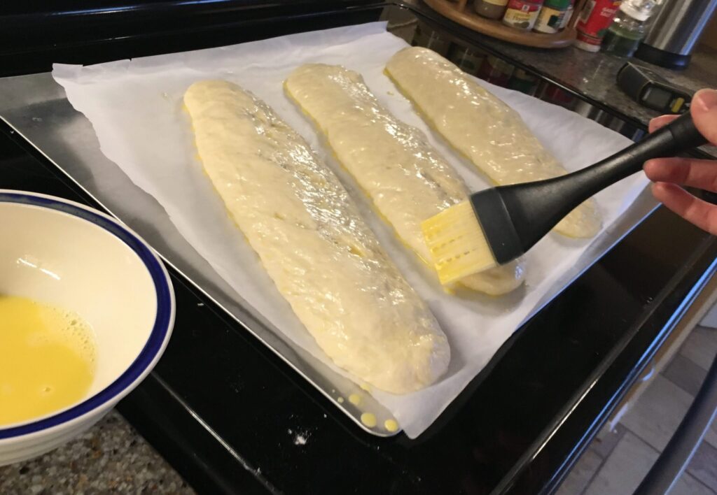 2. Moisten surface of bread by painting with a soft brush dipped in egg wash (2 T water whisked with one egg) for a more golden bread and eliminates need to continue to coat during cooking.