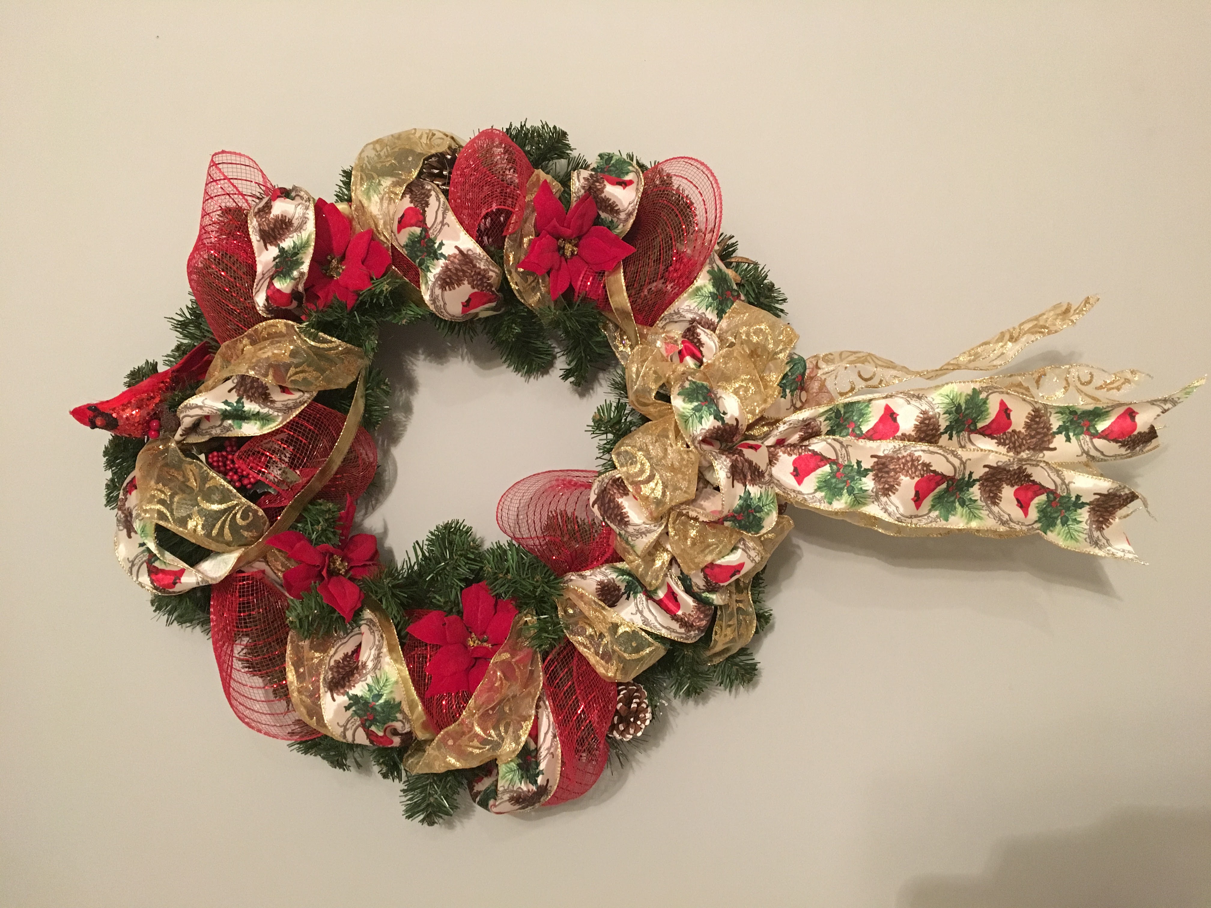 Here’s an alternate Cardinals wreath that I made from a normal wreath with red deco mesh, Cardinal bird ribbon, gold ribbon, poinsettias, and a clip on Cardinal bird.