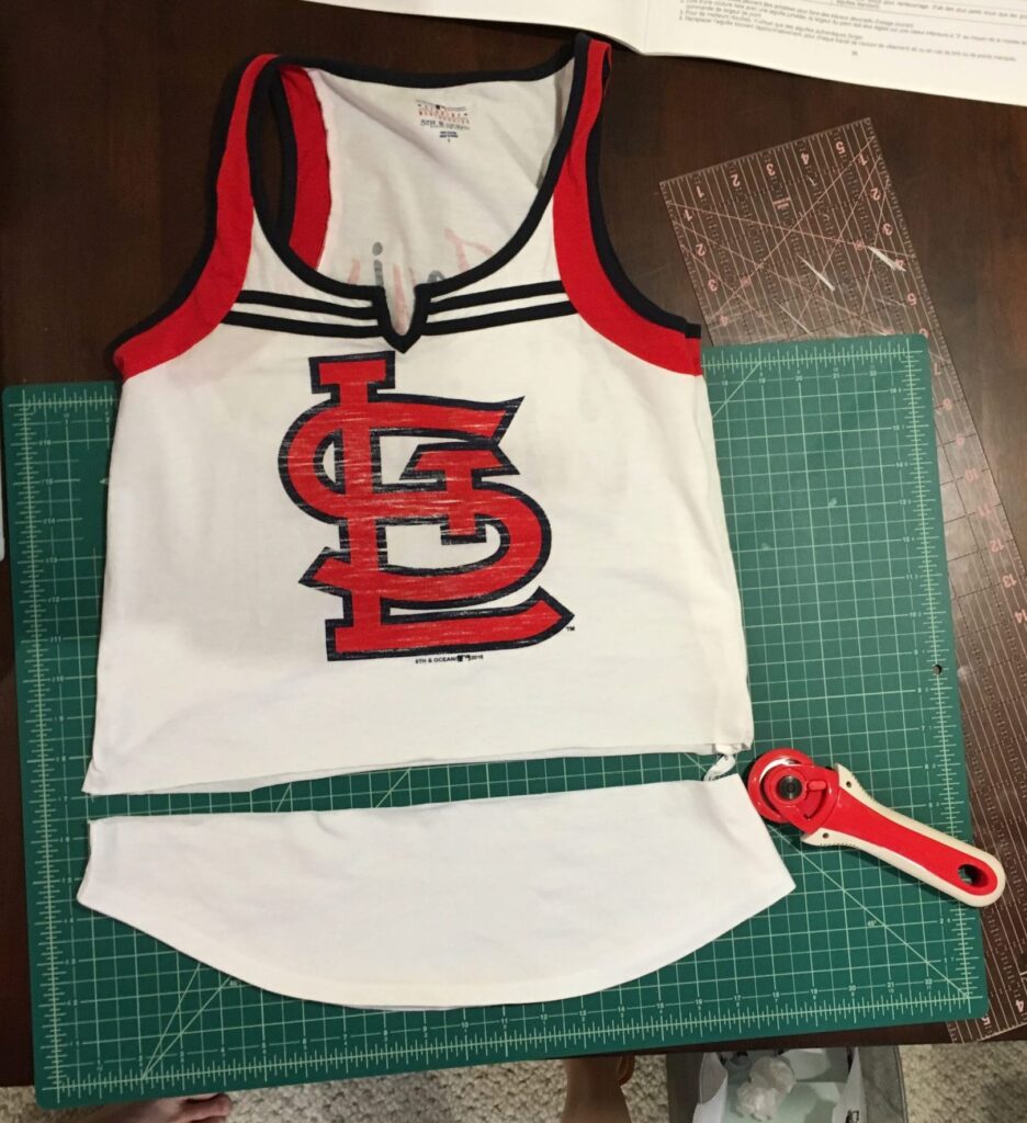 1. Prep tank top: Put on your tank top and make a mark just below your true waist (~2″ below belly button where the top of your jeans typically rest). If the tank is not form fitting, pin the sides to the desired fit. Lay tank top flat on cutting mat and cut across the tank top at the mark using a rotary cutter. If the sides need to be brought in, turn tank inside out and sew along pins. Use a serger or zig zag on the edge.