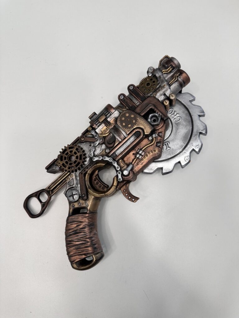 Made a new steampunk gun with an old nerf gun and Rub ‘N’ Buff. The spinning blade looks awesome!