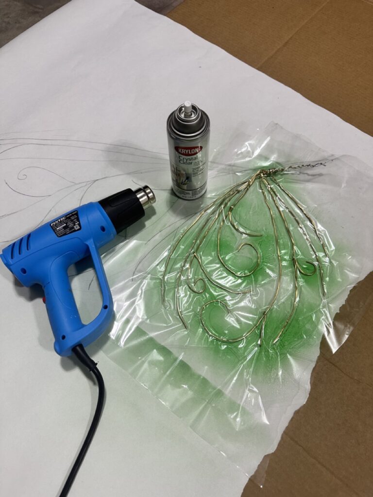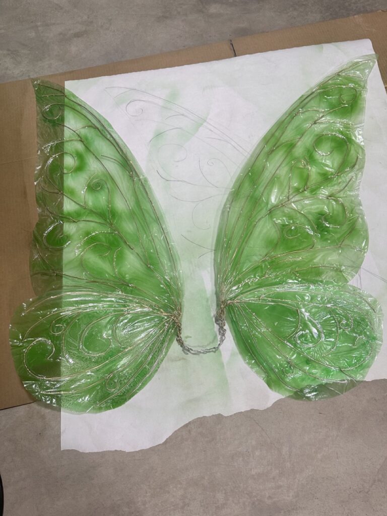 Made the fairy wings with cellophane and bendable wire. Tried a couple different clear sprays (Krylon acrylic spray and Elmer’s spray) and neither worked great to hold together the wings and made my green spray paint bleed. I’ll do a little more searching for a better option before making wings again.