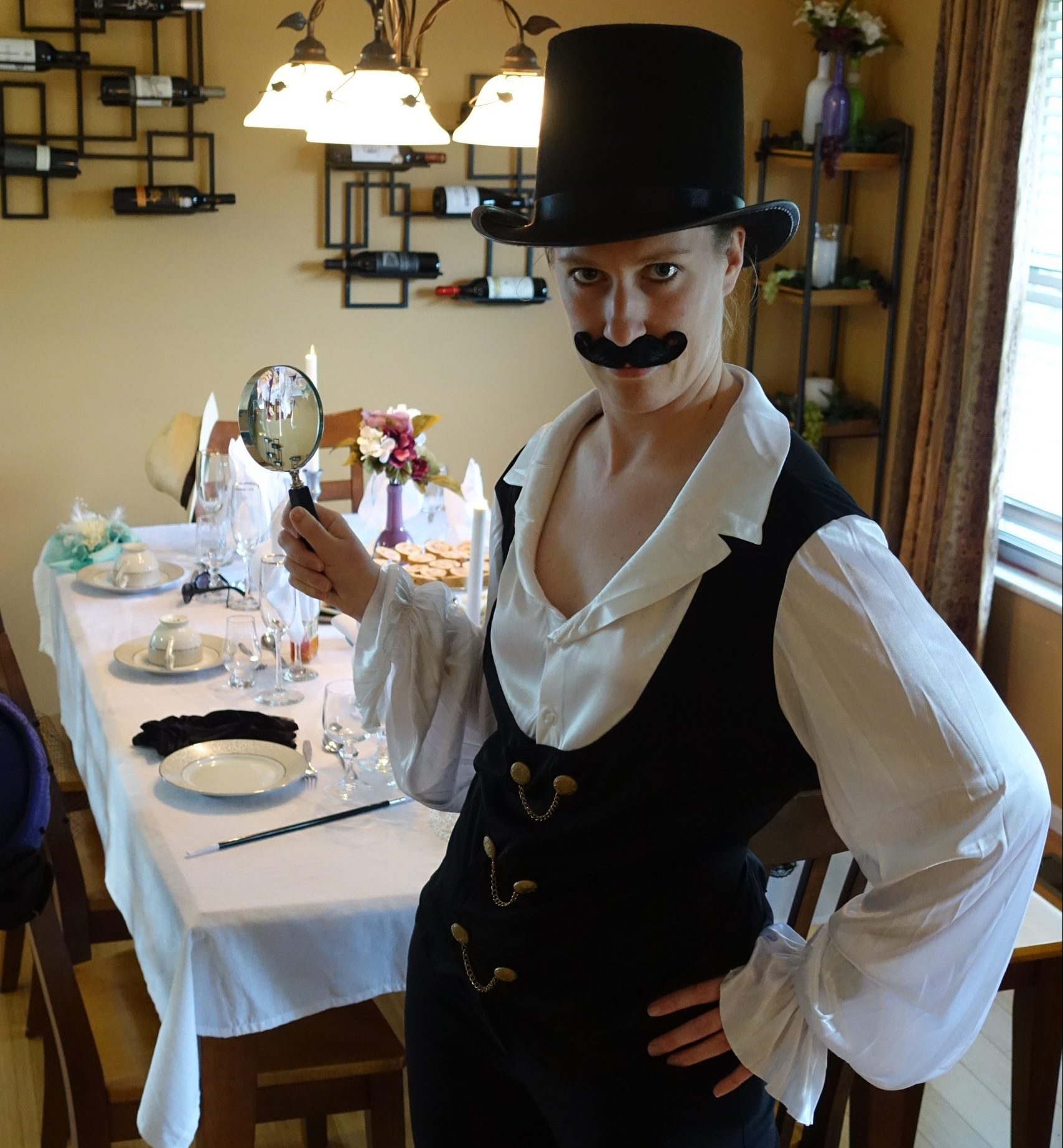 Used my old Tinker Bell costume, got some new boots, and steampunked it with parts from my Steampunk Mad Scientist costume (bracers, corset, test tube belt, pauldron armor, and keys). Filled my test tube belt with tubes of glitter for fairy dust. Had some scrap green curtain material and an old white skirt to add some extra steampunk layers for the skirt. Here’s a video montage of making my fairy wings, wand, and wearing the costume at the STL Ren Fest.