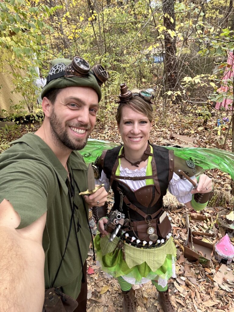 Used my old Tinker Bell costume, got some new boots, and steampunked it with parts from my Steampunk Mad Scientist costume (bracers, corset, test tube belt, pauldron armor, and keys). Filled my test tube belt with tubes of glitter for fairy dust. Had some scrap green curtain material and an old white skirt to add some extra steampunk layers for the skirt. Here’s a video montage of making my fairy wings, wand, and wearing the costume at the STL Ren Fest.