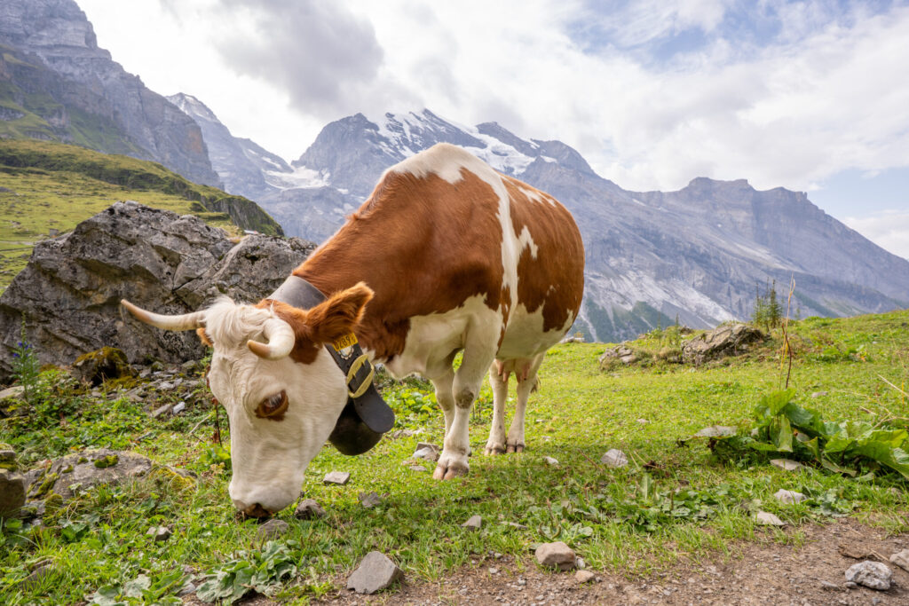 Our hike turned into an unforgettable Swiss adventure thanks to three very memorable cow encounters! One blocked our path like a stubborn trail guardian, another β horns and all β decided to test my nerves by getting a little too close for comfort, and down by the lakeshore, a particularly curious cow tried to steal my lunch right off the beach (see Cowbells in the Alps Video). A few especially chill cows even relaxed right on the beach, soaking up the views beside the turquoise water β the perfect touch to an authentically Swiss hiking experience.