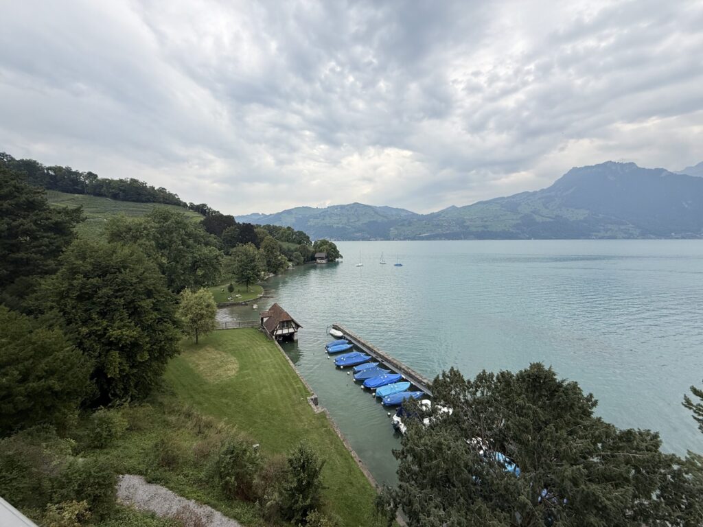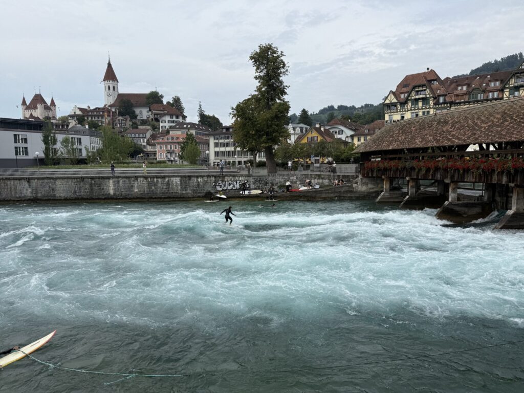 Our final day in Berner Oberland brought a mix of sunshine, clouds, and the perfect balance of adventure and relaxation. We took the train to Kandersteg, rode the gondola up to Oeschinensee, and started the morning with an exhilarating run on the mountain toboggan before setting out on the Lake Oeschinen Loop. This high-alpine hike wound past waterfalls, cliffs, and wildflower meadows with nonstop views of the glacier-fed turquoise lake below. The terrain was steep and rocky in places, but the scenery was nothing short of spectacular. Along the way, we shared the trail with a few curious cows, including one that tried to steal my lunch right off the beach near the lakeshore. As clouds rolled in, we swapped mountain vistas for lakeside charm, visiting Spiez Castle, taking the Lake Thun ferry, and watching local surfers ride the standing river wave in Thun.