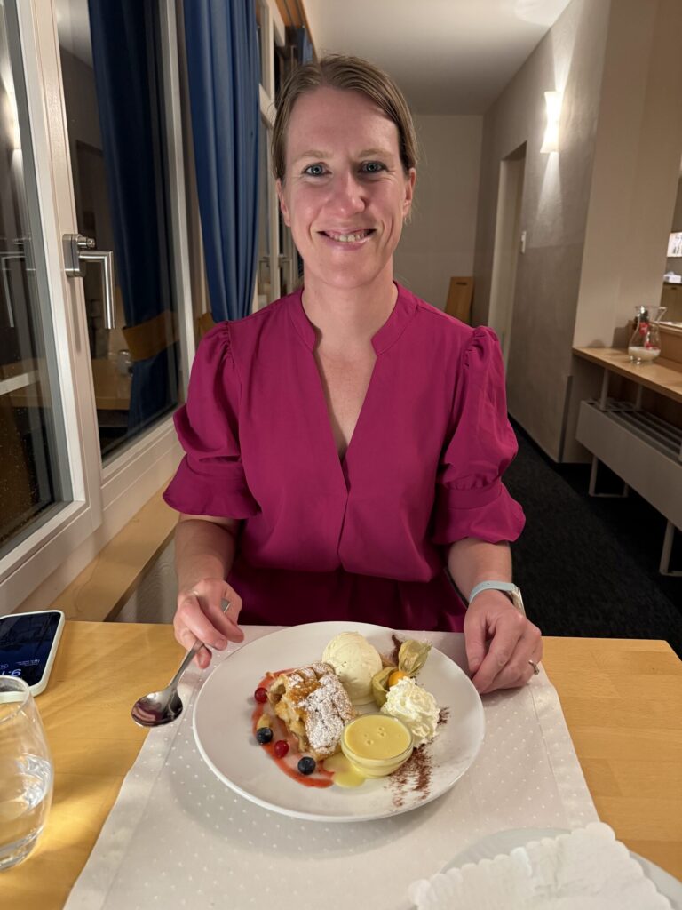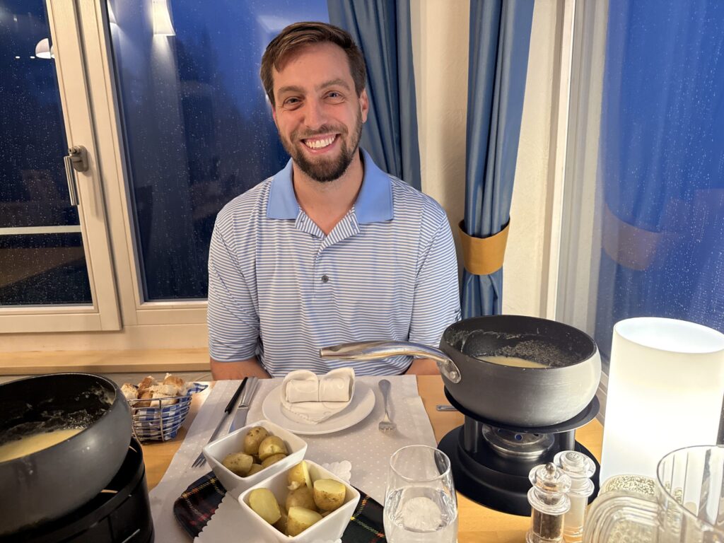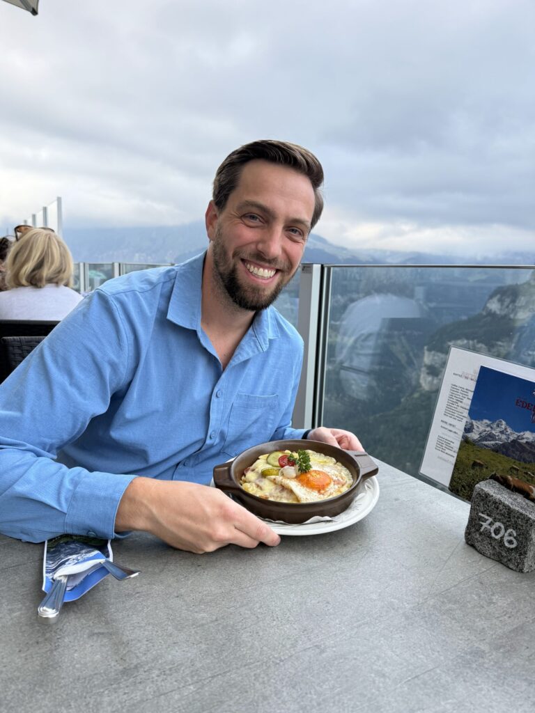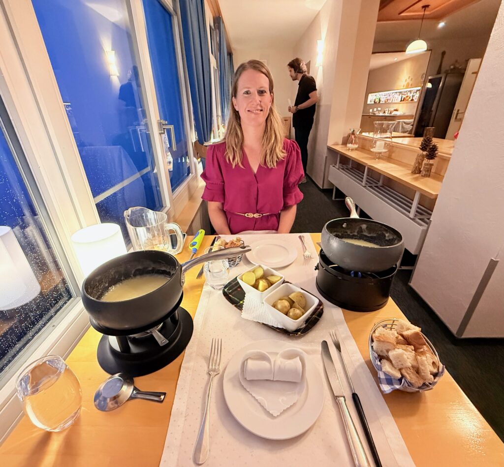 The Panorama Restaurant Alpina, connected to Hotel Alpina, serves up the same blockbuster views as our balcony, whether you’re on the sun-soaked terrace or tucked inside behind picturesque windows. As the newly coined Mr. & Mrs. Fondue (see story below), the silky fondue we had our first night was unforgettable – bubbling, rich, and perfect for dipping. Raclette quickly became one of Scott’s favorite gluten-free meals in Switzerland: they heat a massive wheel of cheese under a broiler, scrape the melted layer onto a plate, then pile it high with veggies (potatoes, pearl onions, pickles, tomatoes, etc.). Throw in a surprisingly bold Thai green curry and the best apple strudel I’ve ever had, and Restaurant Alpina became one of those rare places where every dish somehow lives up to the view.