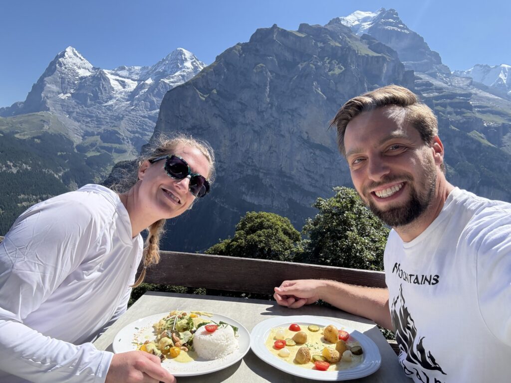 We arrived at our charming Mürren stay, Hotel Alpina, ready for our first gluten-free fondue. The staff instantly won us over – especially one friendly guy we nicknamed Keanu (in the background of the picture below). But the real laugh came at dinner. As soon as we sat down, the waitress set bubbling fondue pots on our table. Confused, we told her we hadn’t ordered yet. She double-checked the reservation and said, “But it says here: Fondue.” Turns out she’d misread Perdue as Fondue. From then on, we proudly embraced our new Swiss alter egos: Mr. and Mrs. Fondue.