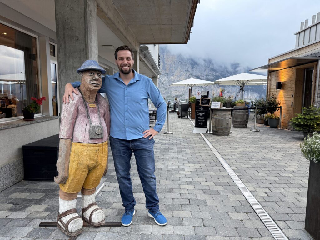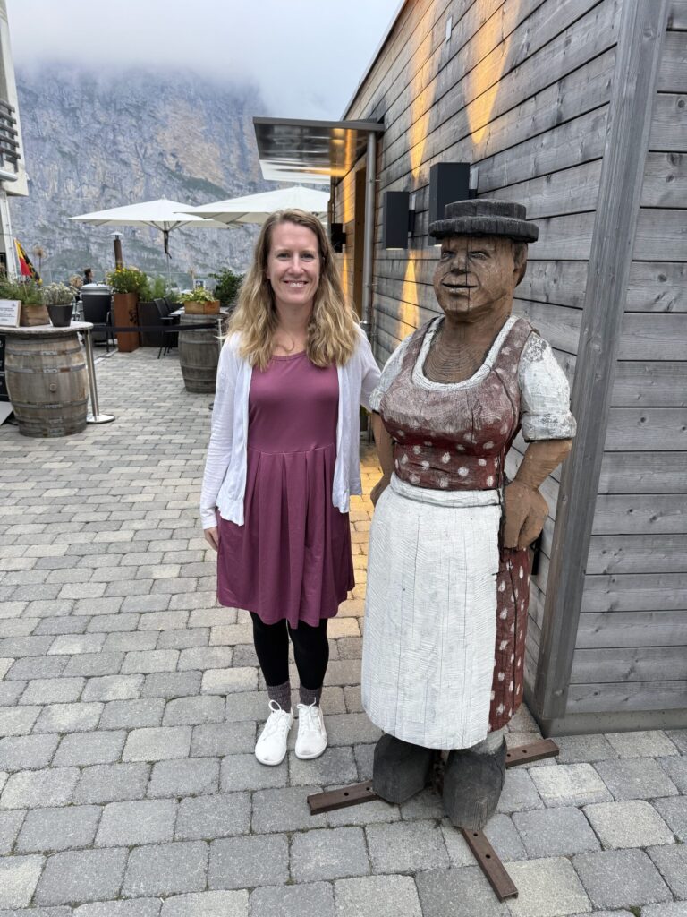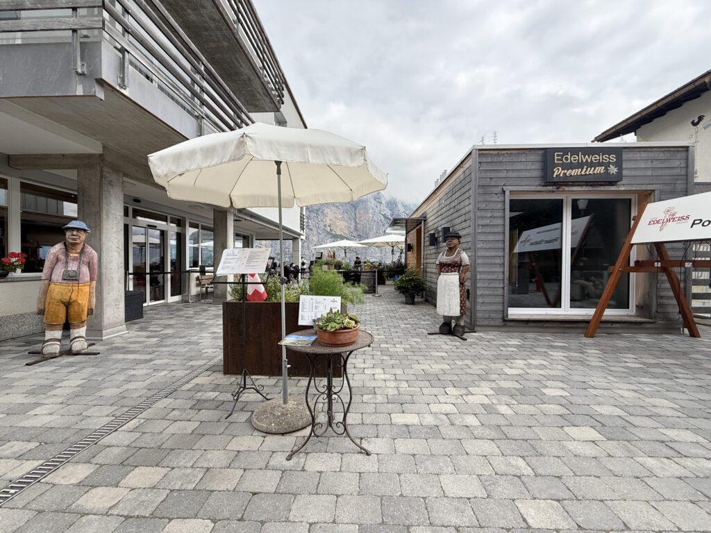 We had dinner at Hotel Edelweiss Restaurant, where the views were also spectacular. The menu had clearly marked gluten-free options (always a win), and Scott enjoyed a hearty rösti while I sipped warm soup and an enchanting rosé. As the evening chill crept in, I asked if they had a blanket – and was promptly brought the one blanket they owned, kindly lent by a coworker. Before heading in, we also made sure to get a few photos with the Edelweiss mascots out front – life-sized statues that are either charming or slightly creepy depending on the lighting. Between the crisp air, comfort food, borrowed blanket, and alpine oddities, it was dinner we won’t forget.